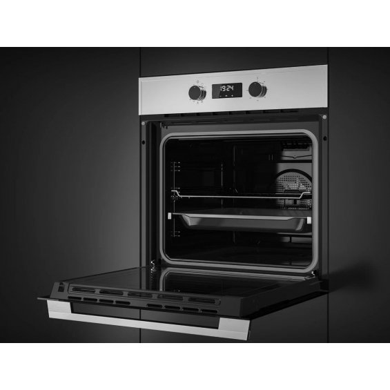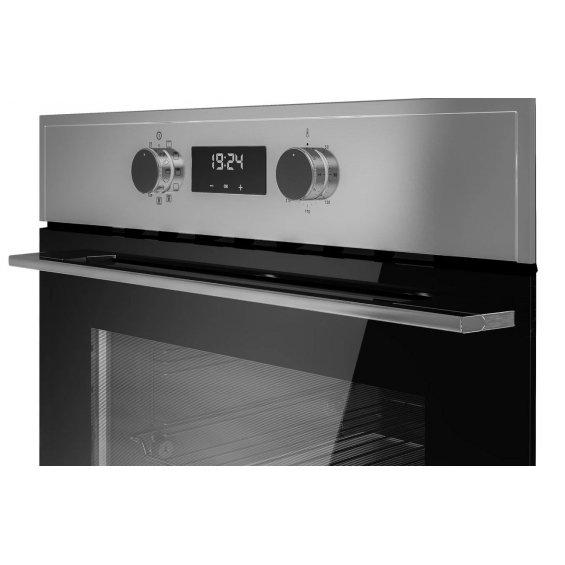 Este horno cuenta con un diseño elegante y moderno en inox, con una cavidad esmaltada que facilita la limpieza. Su ventilación tangencial de dos velocidades y el sistema de 1 guía Plus-Extension ofrecen un uso cómodo y eficiente, adaptándose a todas tus necesidades. Además, su sistema de seguridad incluye desconexión automática con apertura de puerta, bloqueo de panel, protección para niños y termostato de seguridad, garantizando un funcionamiento seguro en todo momento.