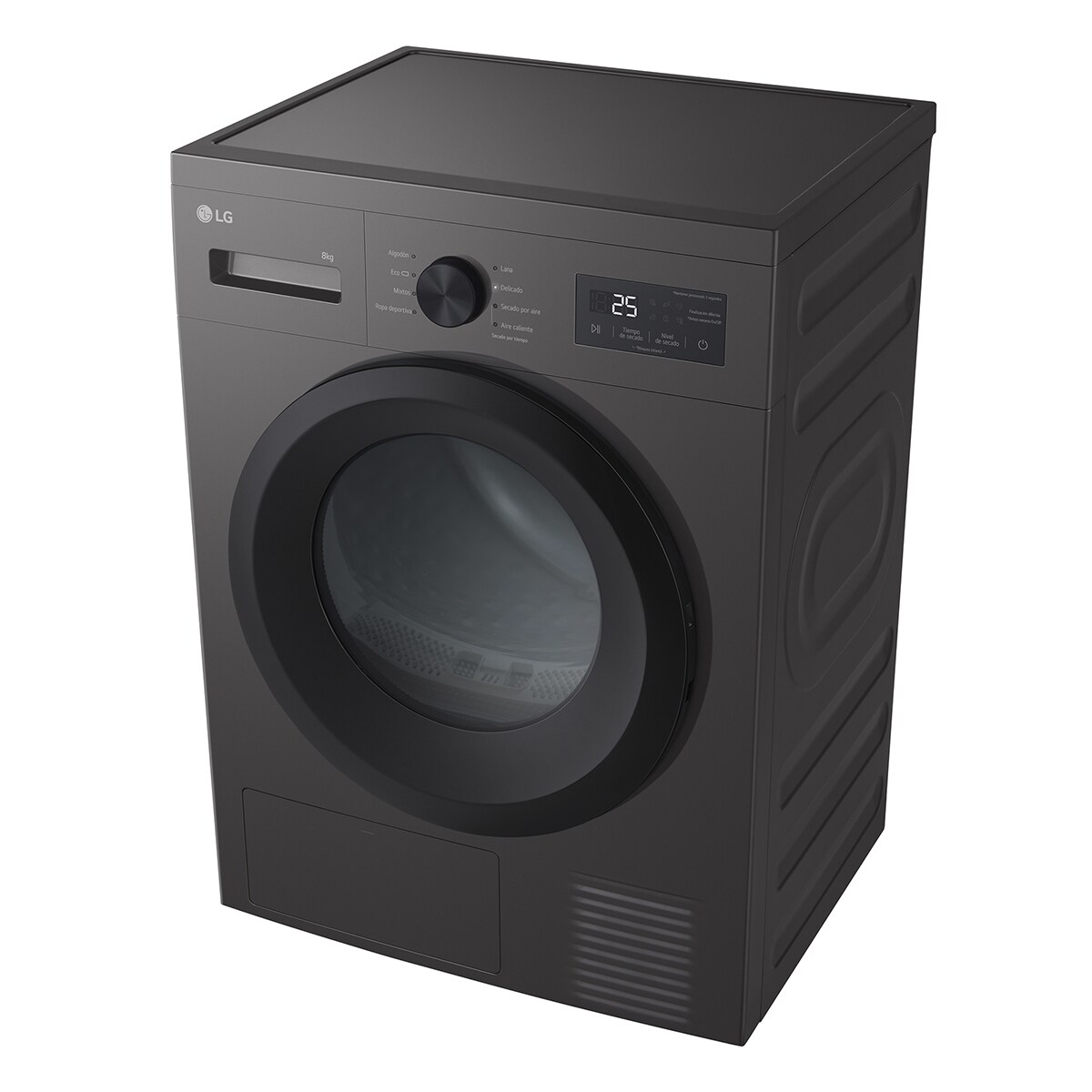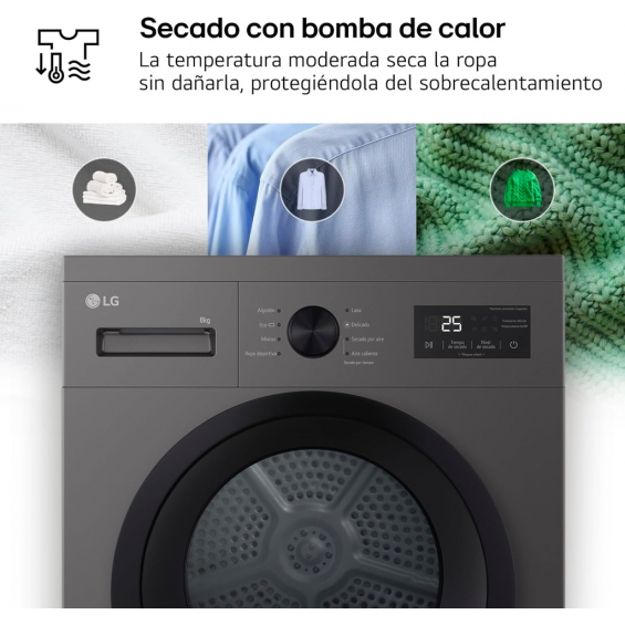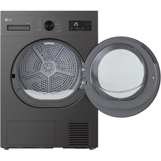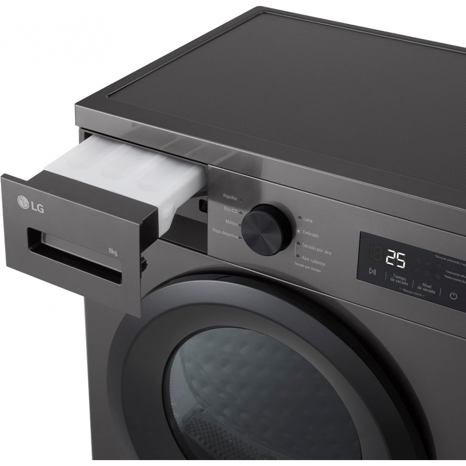 Comprar al mejor precio secadora con bomba de calor LG RHA1008NDK Serie 100 8kg en color grafito silver. Disfruta de un secado eficiente, delicado y con un diseño moderno gracias a esta secadora de 8 kg de capacidad equipada con bomba de calor eléctrica , que trabaja a temperatura moderada para proteger tus prendas frente al sobrecalentamiento y al desgaste. Su elegante acabado en negro grafito silver aporta un toque sofisticado a cualquier zona de lavado, combinando estilo y funcionalidad en una auténtica gran oferta para tu hogar.