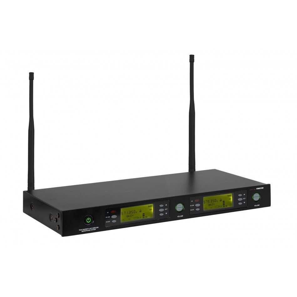 | CARACTERÍSTICAS | Receptor doble true diversity con 2 micrófonos de solapa con cápsula de condensador electret unidireccional y 2 transmisores inalámbricos de petaca. Función auto scan. Transmisión del canal al micrófono por IR. Antenas desmontables. Con varios receptores, máximo 4 - 5 micrófonos al mismo tiempo. Para más micrófonos usar otras bandas de frecuencia. |