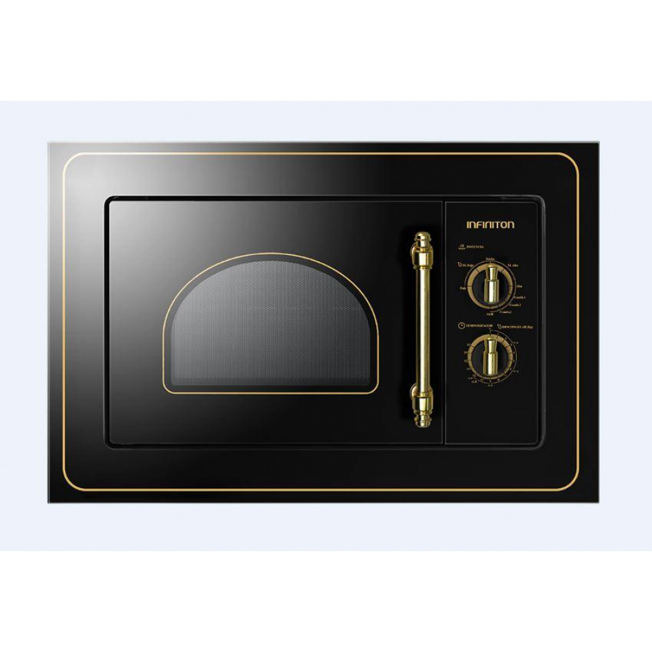 MICROONDAS INTEGR. Infiniton IMWRU20 20L 800W GRILL NEGRO Diseño Rústico en Negro con Tiradores y botones color oro // Temporizador 0 - 95 minutos // Función Grill // 8 programas // Bloqueo infantil // Iluminación interior // Diametro del plato 24,5 cm // Incluye parrilla circular // Alto x Ancho x Largo: 343 x 595 x 388 mm