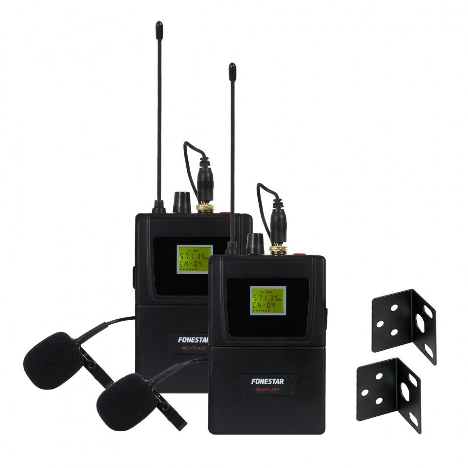 | CARACTERÍSTICAS | Receptor doble true diversity con 2 micrófonos de solapa con cápsula de condensador electret unidireccional y 2 transmisores inalámbricos de petaca. Función auto scan. Transmisión del canal al micrófono por IR. Antenas desmontables. Con varios receptores, máximo 4 - 5 micrófonos al mismo tiempo. Para más micrófonos usar otras bandas de frecuencia. |