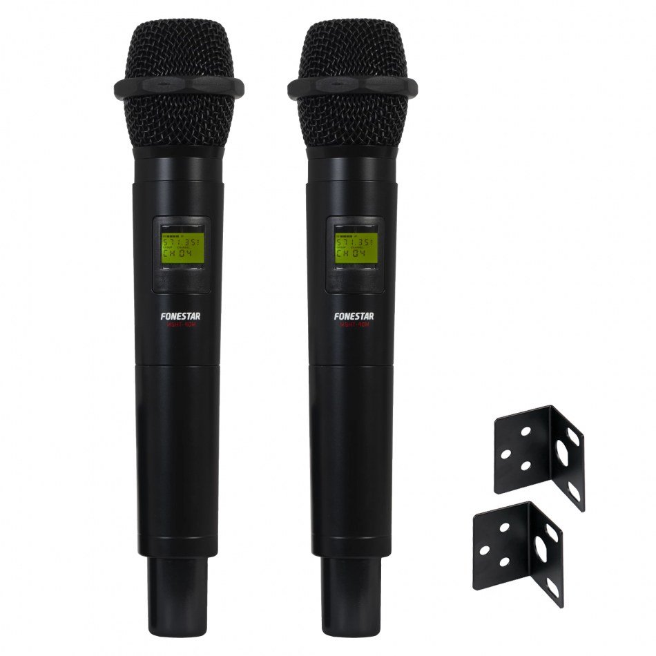 | CARACTERÍSTICAS | Receptor doble true diversity con 2 micrófonos inalámbricos de mano con cápsula de condensador electret unidireccional. Función auto scan. Transmisión del canal al micrófono por IR. Antenas desmontables. Con varios receptores, máximo 4 - 5 micrófonos al mismo tiempo. Para más micrófonos usar otras bandas de frecuencia. |