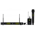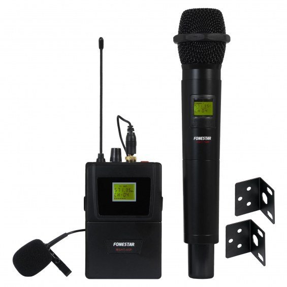 | CARACTERÍSTICAS | Receptor true diversity con 1 micrófono inalámbrico de mano con cápsula de condensador electret unidireccional y 1 micrófono de solapa con cápsula de condensador electret unidireccional y transmisor inalámbrico de petaca. Función auto scan. Transmisión del canal al micrófono por IR. Antenas desmontables. Con varios receptores, máximo 4 - 5 micrófonos al mismo tiempo. Para más micrófonos usar otras bandas de frecuencia. |