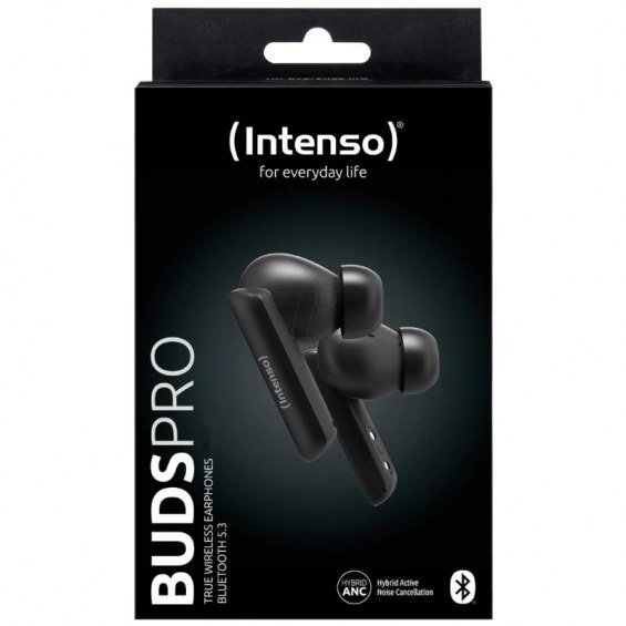 | Características | - Cancelación activa de ruido híbrida (ANC) - Cancelación de ruido ambiental (ENC) - Modo de transparencia para dejar pasar el ruido ambiental - Modo Música - Modo de juego - Pantalla LED: nivel de batería - A prueba de salpicaduras (IPX4) - Ajuste ergonómico - Control táctil intuitivo - Control de volumen táctil - Establecimiento automático de conexión - Soporte de asistente de voz Batería - Hasta 9 horas de funcionamiento con una sola carga - Hasta 35 horas de funcionamiento incl. caja de carga - Batería recargable de polímero de litio - Carga universal a través de USB-C - Tiempo de carga: ~2 horas Bluetooth Bluetooth 5.3 Alcance: hasta 15 m (línea de visión) Nombre de Bluetooth: Intenso Buds Pro Dimensiones y peso - 6,4 x 20,9 x 24,7 mm - 4,5 gramos - Caja de carga: 54,96 x 55,1 x 28,44 mm - Caja de carga: ~38 gramos Contenido - 2 x Buds Pro - Caja de carga - Auriculares en 4 tamaños - Cable USB-C a USB-C |