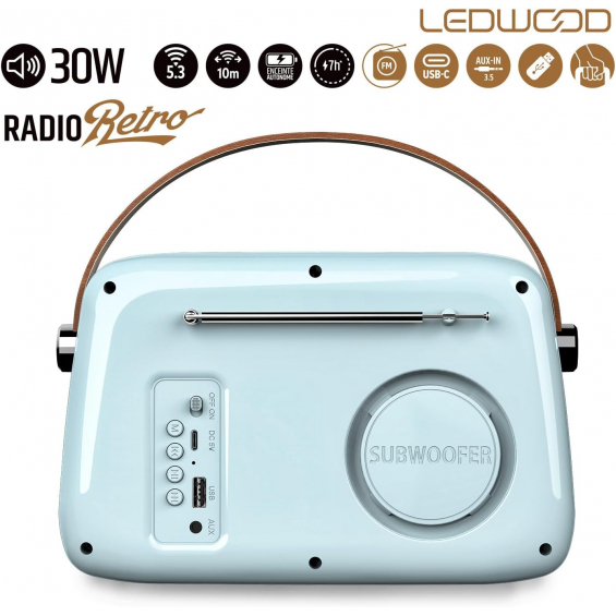 Comprar al mejor precio la radio retro vintage portátil Ledwood ALMA , un dispositivo con diseño clásico y prestaciones modernas que combina el encanto de las radios de época con la tecnología actual. Con potencia de sonido de 30W , radio FM , Bluetooth 5.3 , entrada USB y batería recargable, es perfecta para disfrutar de tu música favorita en cualquier lugar con un estilo único.