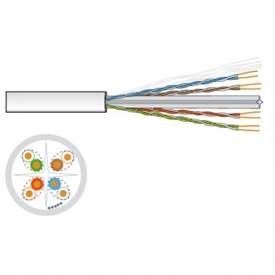 | CARACTERÍSTICAS | Cable Cat 6 UTP 250 MHz de 8 conductores sólidos agrupados en 4 pares trenzados con colores codificados para voz y datos Nylon de rasgado Cubierta exterior: 5'5 mm Ø, PVC gris 8 cables: Cubierta de conductor: 1 mm Ø, PE verde, verde/blanco, naranja, naranja/blanco, marrón, marrón/blanco, azul, azul/blanco Conductor: 1 hilo de CCA de 0'51 mm Ø 24 AWG |