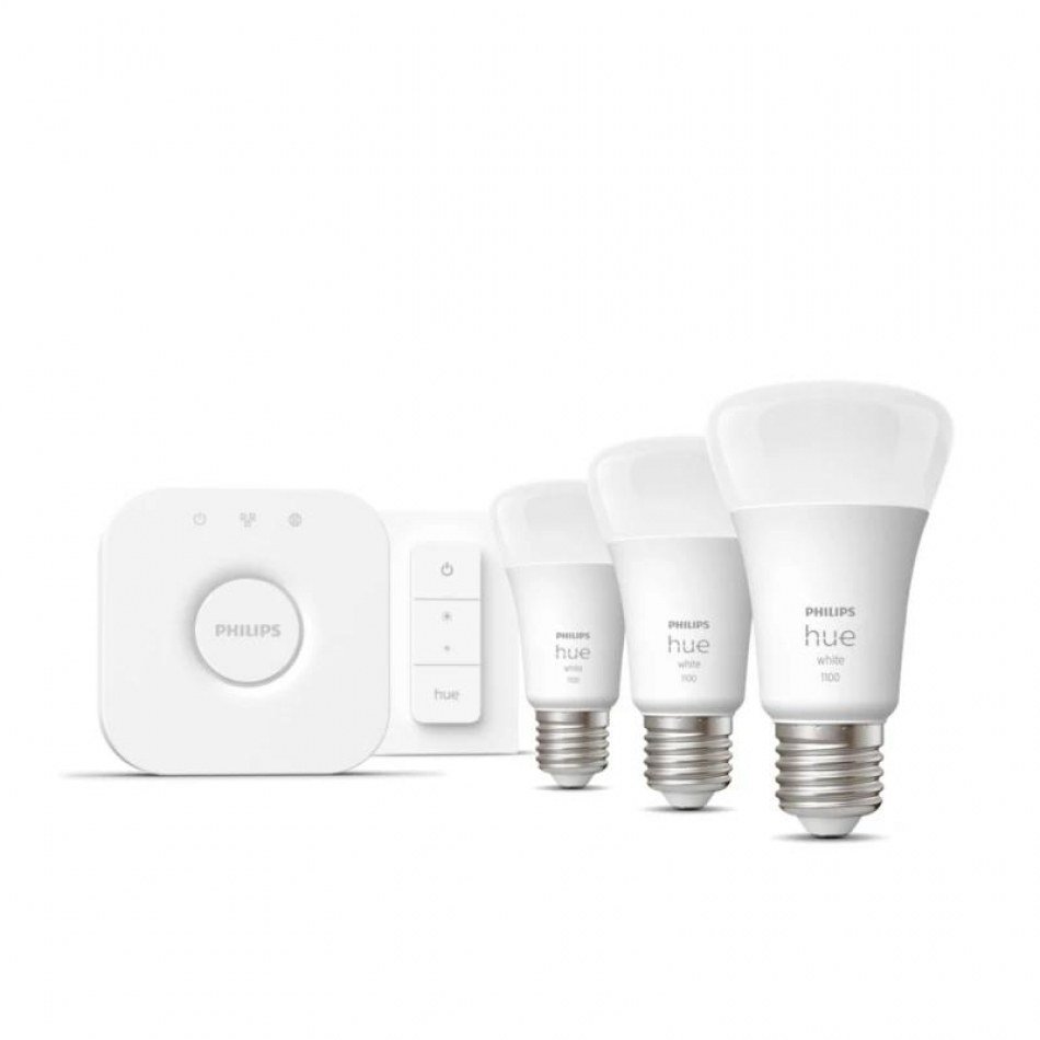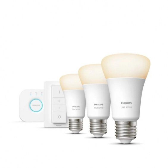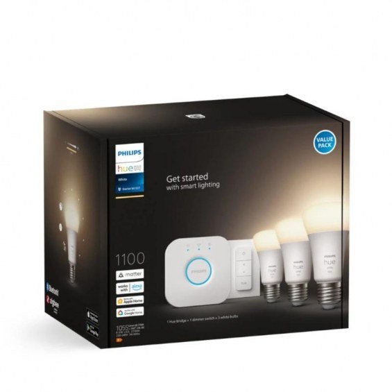 | Otras características | Compatible - Compatible con la característica Efectos - Compatible con HomeKit: iOS 11 or later - Aplicación Philips Hue: IOS 14 y superior Android 10.0 y superior - Asistentes de voz: Amazon Alexa Dimensiones y peso - 61 x 110 mm - 67g Contenido - 1 x bridge - 1 x cable de red Ethernet - 3 x bombillas hue - 1 x conmutador de regulación Hue - 1 x adaptador de corriente |