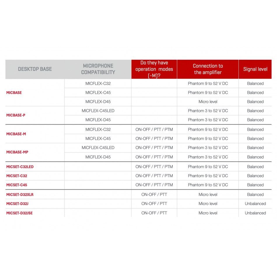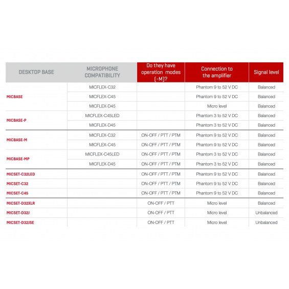 | COMPATIBILIDAD | MICBASE-P: Bases de sobremesa (con circuito preamplificador) MICBASE-MP: Bases de sobremesa (con circuito preamplificador) MIC-SCF-D: Micrófono de sistema de conferencias MIC-SCF-P: Micrófono de sistema de conferencias |