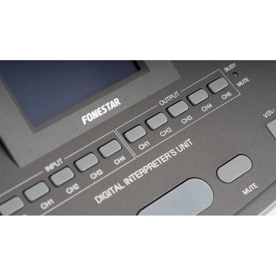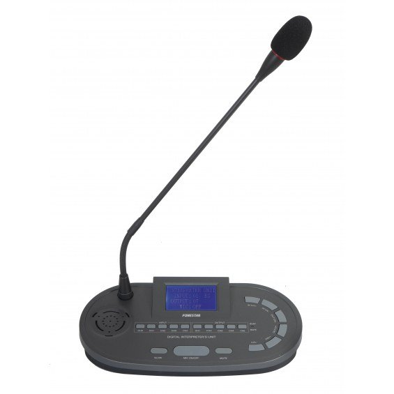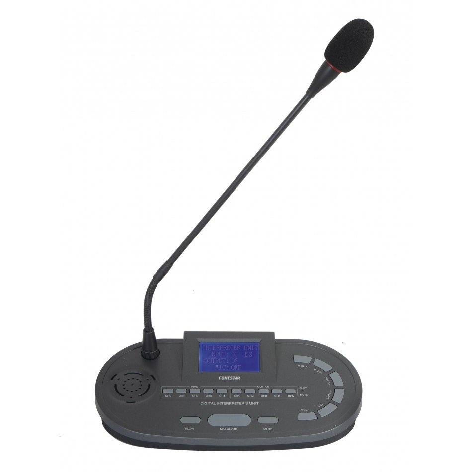 | CARACTERÍSTICAS | Micrófono de sobremesa con flexo para traducción simultánea. Selección de canal de entrada y salida. Función mute cough. Altavoz monitor. Pantalla de información. Conexión en cascada. Anillo luminoso de funcionamiento. |