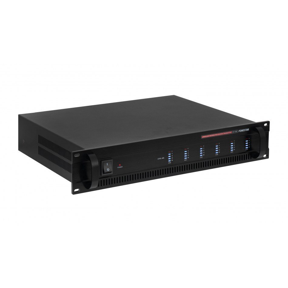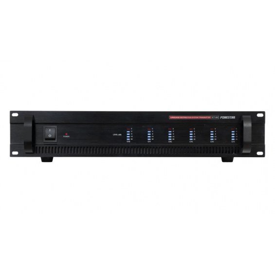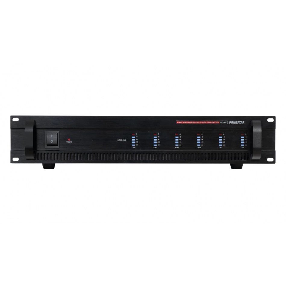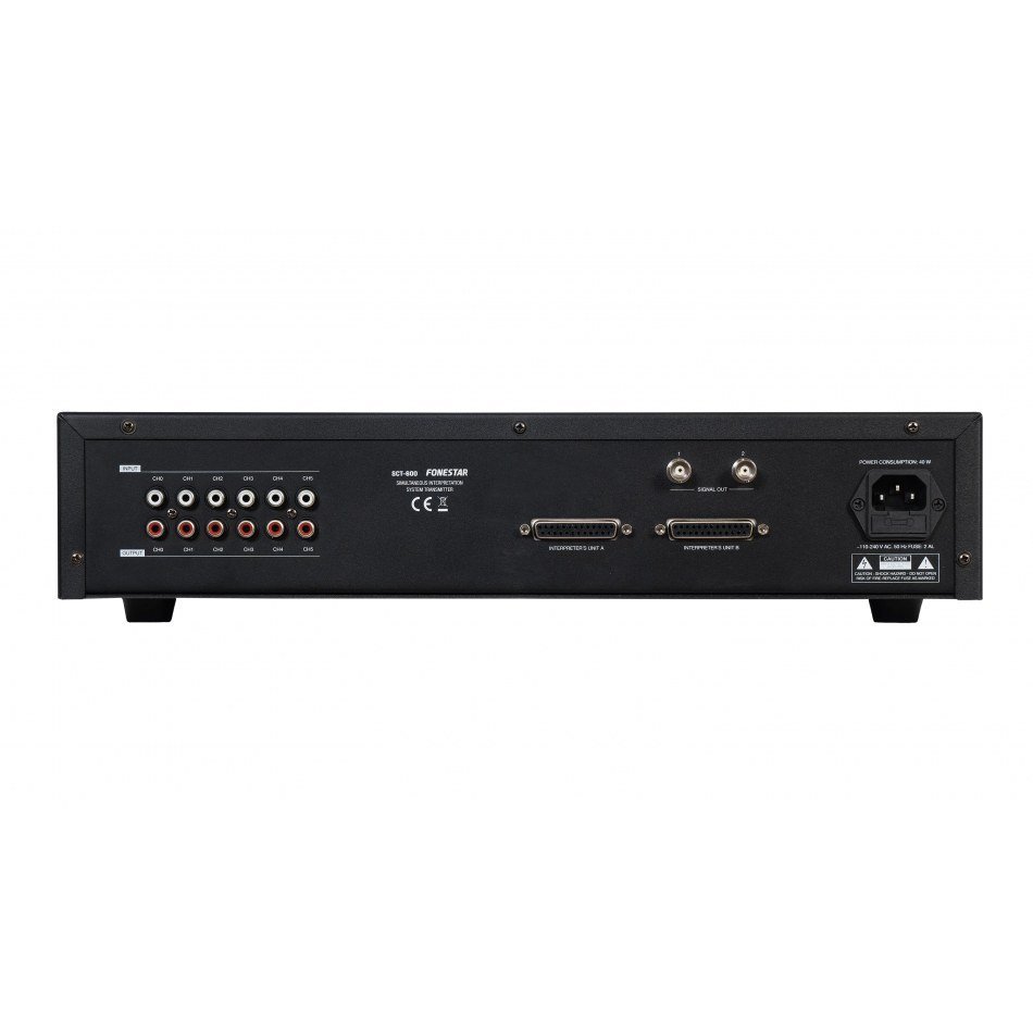 | CARACTERÍSTICAS | Transmisor del sistema de traducción simultánea SCT. Hasta 5 idiomas, además del idioma original. Conexión de hasta 10 micrófonos SCT-61M o SCT-122M en cascada. Control automático de volumen de salida. Transmisión del canal base Canal 0 por los otros canales cuando el micrófono del traductor esté apagado. Construido conforme normas IEC 60914 de Sistemas de Conferencias e IEC 61603-7 de Sistemas de Transmisión. |