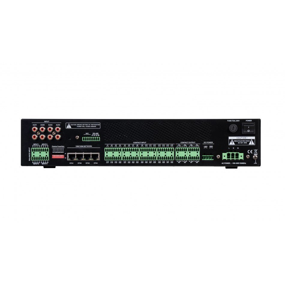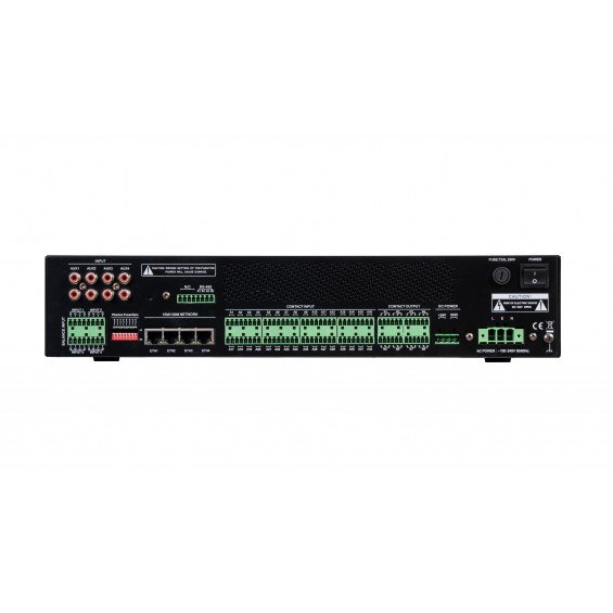 | CARACTERÍSTICAS | Sistema de gestión de entradas de audio entradas/salidas de propósito general. Ampliación del sistema de megafonía y alarma por voz EN 54. 4 entradas de línea balanceadas que transmite por red al resto del sistema. Reproductor de mensajes. 32 entradas de apertura/cierre de contactos supervisadas, euroblock. 8 salidas de apertura/cierre de contactos de propósito general, euroblock. Memoria interna de 512 MB y memoria de 16 GB con tarjeta SD interna. 4 ethernet, RJ45. 2 puertos de comunicación RS-485. Un ZS-4328IO puede controlar y sincronizar 32 ZS-2000M. |