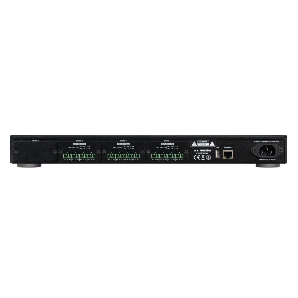 | CARACTERÍSTICAS | Dispositivo de 12 salidas de propósito general para sistema de audio IP. Actualización remota mediante software para PC o de manera local a través de USB. |