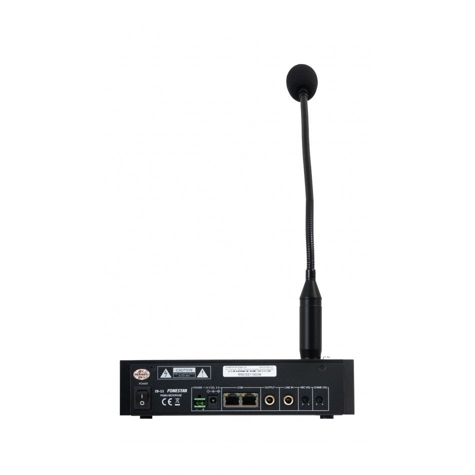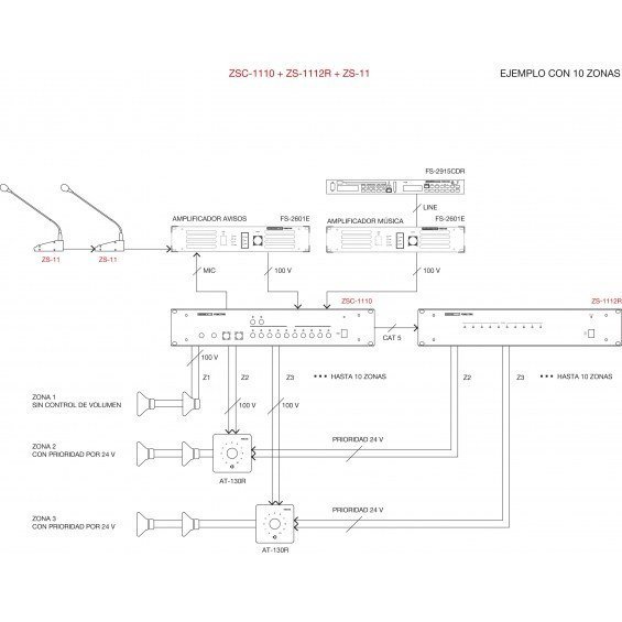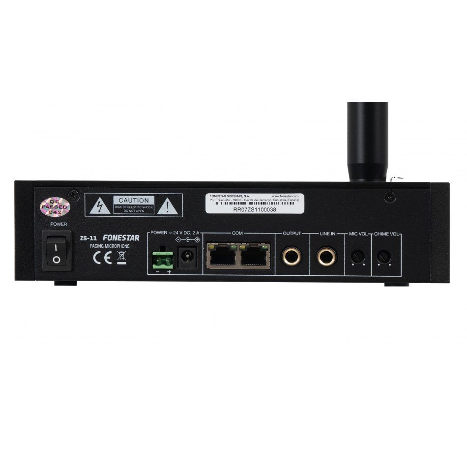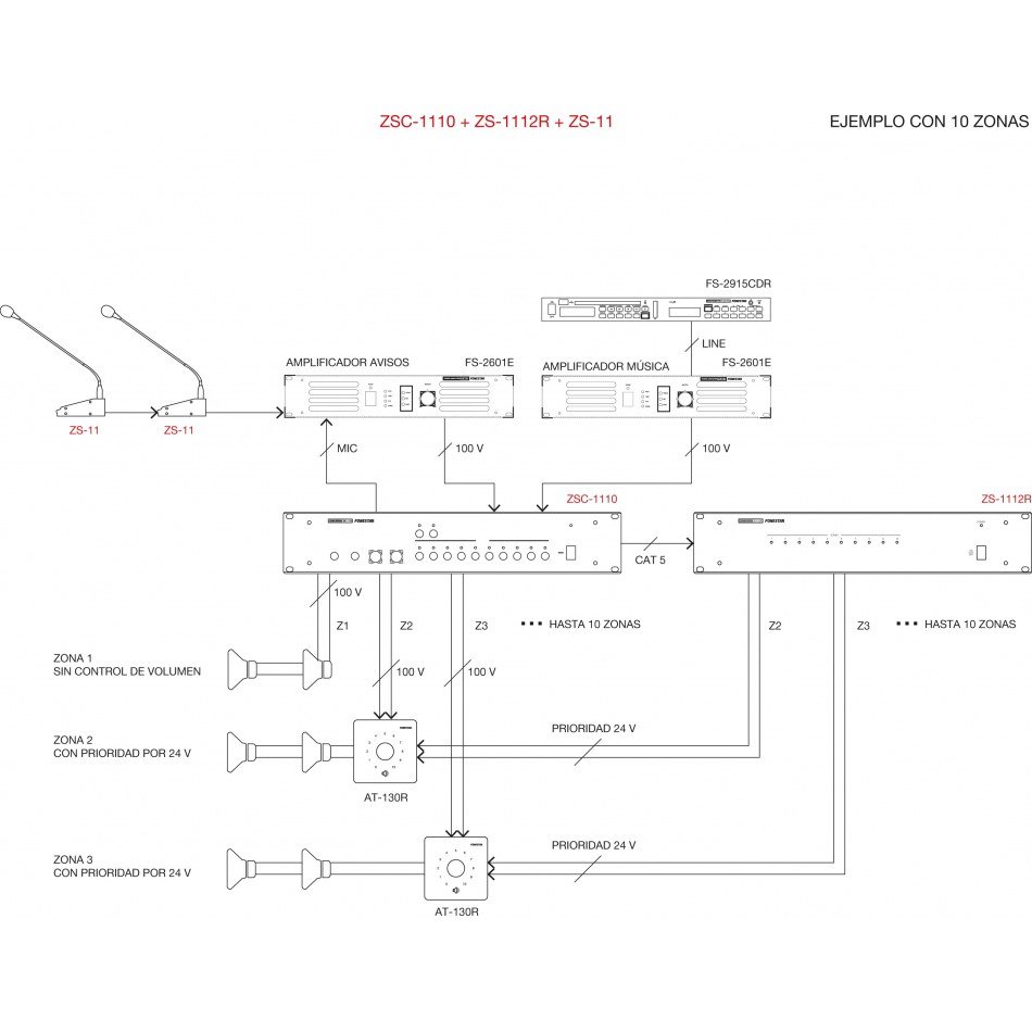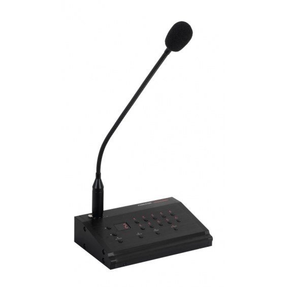 | CARACTERÍSTICAS | Micrófono con botones de selección directa de 10 zonas. Selección de hasta 300 zonas. Selecciona la zona para avisos en el ZSC-1110. Selecciona prioridad para atenuadores 24 V en el ZS-1112R. Control de volumen de micrófono y de tonos musicales de aviso. |