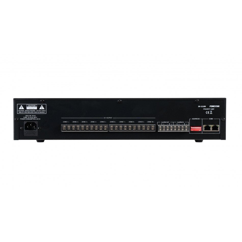 | CARACTERÍSTICAS | Unidad de control de 10 zonas para activación de prioridad en atenuadores con relé 24 V. Ampliable a 300 zonas. Conexión Cable Cat 5e, Comunicación RS-485 que puede llegar hasta 1000 metros ZS-1112R Funciona junto a la central de alarma ZSC-1110, activa la la prioridad 24 V para atenuadores cuando hay un mensaje enviado desde el micrófono ZS-11. La función ALARM-IN no tiene reseteo automático. Necesita ser reseteada manualmente. |