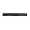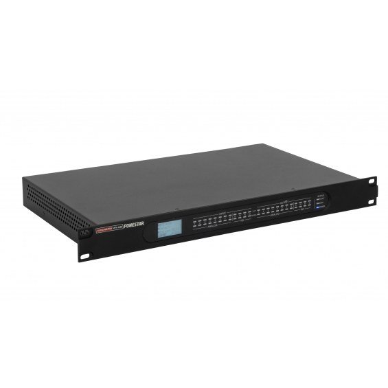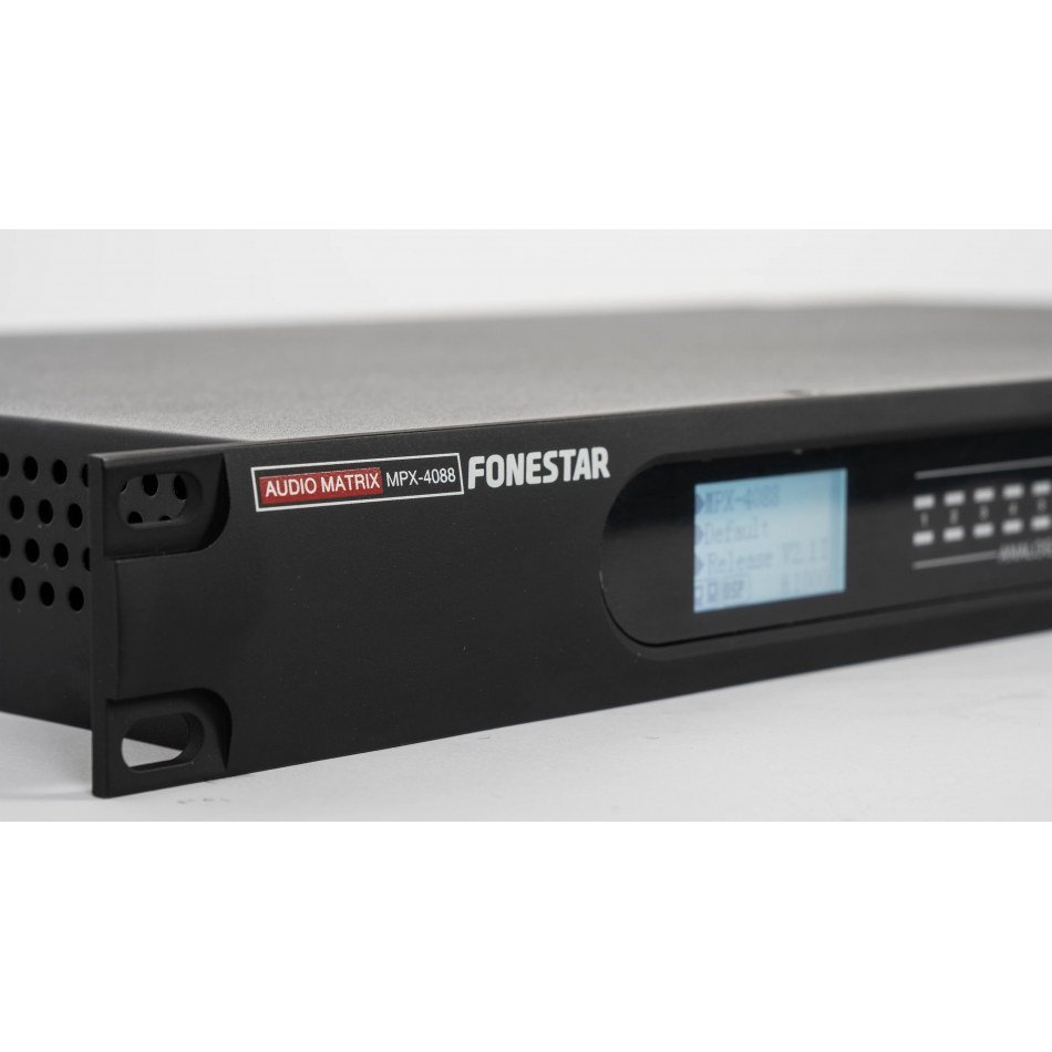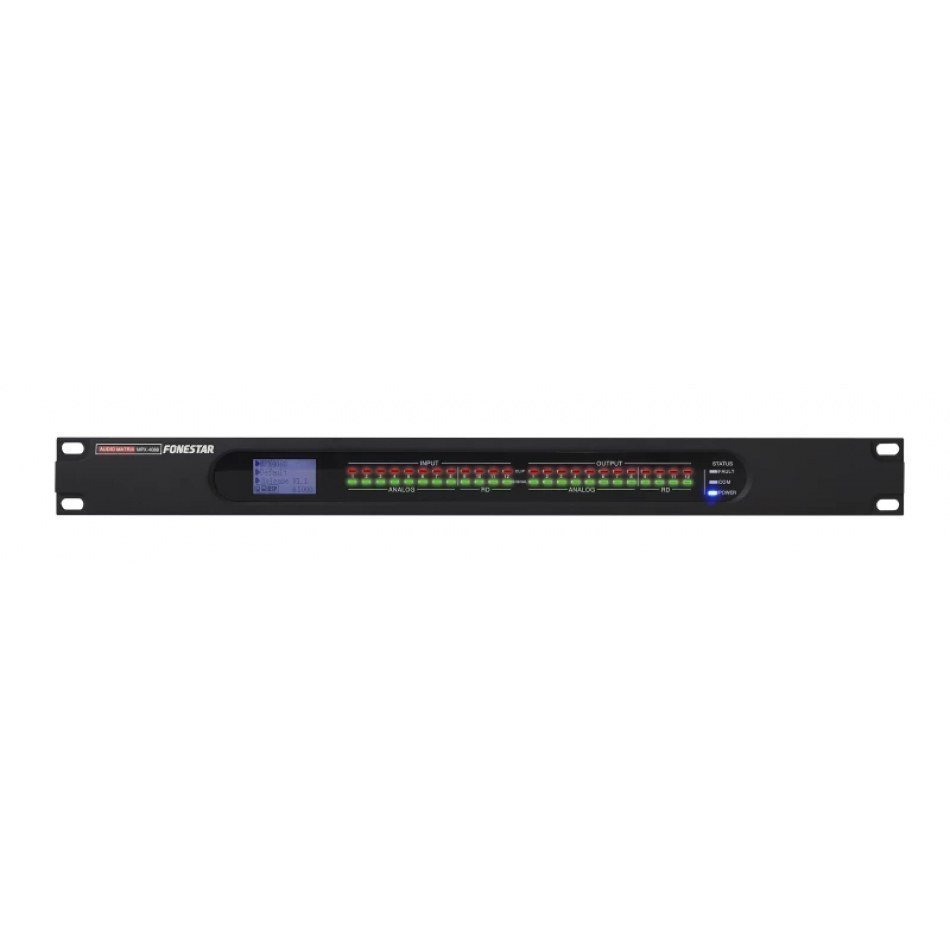 | CARACTERÍSTICAS | Matriz de audio de 8 canales analógicos de entrada a 8 zonas de salida. 4 canales digitales de entrada/salida configurables para uso con los mandos de control mod. MPX-400MIC, MPX-410ES, MPX-430VS. Mandos de control zonal opcionales mod. MPX-420V y MPX-430VS para selección del programa emitido en la zona. Software de control para PC. Indicadores luminosos de encendido, ocupación de bus, señal y fallo. Pantalla LCD de información. Micrófono con prioridad y selección de zonas opcional mod. MPX-400MIC. Compatible con DANTE. |