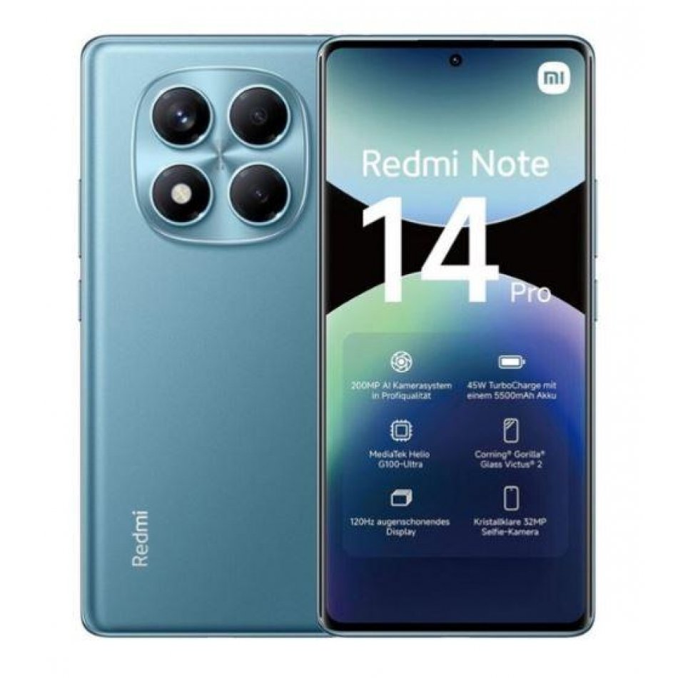 T. MOVIL XIAOMI REDMI NOTE 14 PRO 8+256GB AZUL Pantalla 6,67" AMOLED // MediaTek Helio G100-Ultra // RAM 8GB // ROM 256GB // Cámaras 200+8+2 / 32 Mpx // Batería 5500 mAh // Carga rápida 45W // S.O Xiaomi HyperOS // NFC