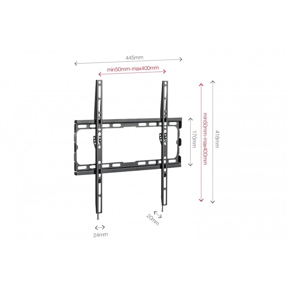 Este soporte FIX-044EN destaca por su diseño extraplano que permite fijar televisores de 32 a 70 pulgadas (81,3 a 177,8 cm) con una estética elegante y discreta, ideal para cualquier espacio. Compatible con múltiples formatos VESA (75x75, 100x100, 100x150, 150x100, 100x200, 200x100, 150x150, 200x200, 200x300, 300x200, 200x400, 400x200, 300x300, 300x400, 400x300, 400x400), este soporte asegura un ajuste firme y adaptable a distintas configuraciones de pantallas, manteniéndolas a solo 2 cm de la pared.