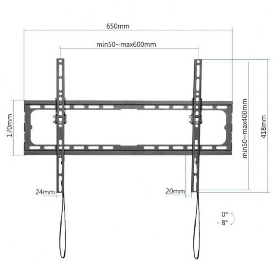 | Características | - Monitor soportado: 37"-80" - VESA: 200x200, 300x200, 300x300, 400x200, 400x300, 400x400, 600x400 - Peso máximo soportado: 45 kg - Ángulo: Inclinación: 0°/ -8° - Distancia a pared: 20 mm - Color: negro - Peso neto: 1,04 kg - Peso bruto: 1,24 kg - Medidas (embalaje): 655 x 175 x 28 mm - Incluye manual, tornillería e instrucciones de instalación - Cumple especificaciones RoHS |